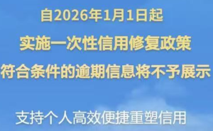【权威转发】近日,中国人民银行发布了一项重磅惠民政策,为受疫情等因素影响的个人信用修复打开了“绿色通道”。自2026年1月1日起,符合条件的小额逾期记录将可被一次性修复,并不再展示于个人信用报告中。这意味着,许多曾因短期困难而留下信用“疤痕”的个人,将有机会卸下历史包袱,真正轻装前行。